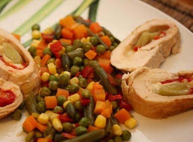 Mod de preparare: Pieptul de pui se spala, se zvanta si se portioneaza. Fiecare felie se bate cu ciocanul de snitele. Pe fiecare felie de carne se pun o felie de sunca si una de cascaval, apoi se ruleaza si se fixeaza cu scobitori. Intr-o tigaie de teflon, se topesc 2 linguri de unt si se prajesc uniform ruladele la foc potrivit, timp de 10 minute. Ruladele prajite se scot intr-un vas si se pastreaza calde. In tigaie se adauga untul ramas. Ceapa si usturoiul se curata, se spala si se toaca, apoi se calesc. Dupa 5 minute, se toarna supa si smantana; se fierb inabusit, la foc mic, timp de 10 minute. Acum se adauga in sos telemeaua rasa. Se condimenteaza si se lasa pe foc mic inca 5 minute, pentru a se lega. La servire, peste rulade se toarna din sosul preparat, iar alaturi se pune o portie de legume asortate, fierte in aburi.