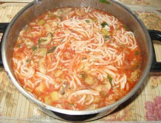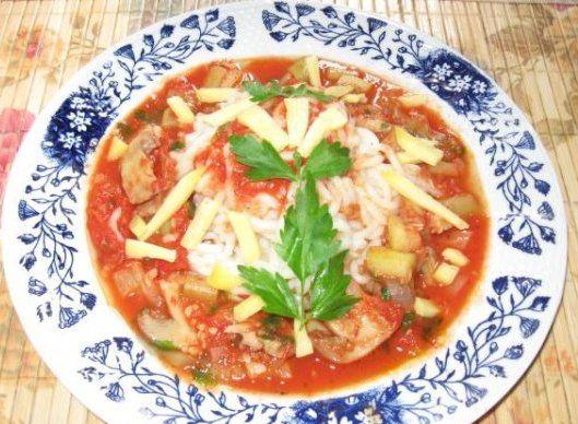 Ceapa, usturoiul si ciupercile proaspete se inabusa bine in 3-4 linguri ulei de masline, se adauga cubuletele de vanata, dovlecel si ardei gras si se lasa sa fiarba. Cand sunt patrunse se adauga rosiile, suc de rosii, pasta de tomate sau ketchup dupa gust si se lasa sa fiarba la foc mic. Spre sfarsit se adauga 100 g cascaval taiat cubulete se sareaza si condimenteaza dupa gust. Restul de cascaval se pastreaza pentru servire. Inainte sa se opreasca focul se adauga patrunjelul tocat. Daca sosul vi se pare prea gros se mai poate adauga putina apa fiarta sau suc de rosii in sos.