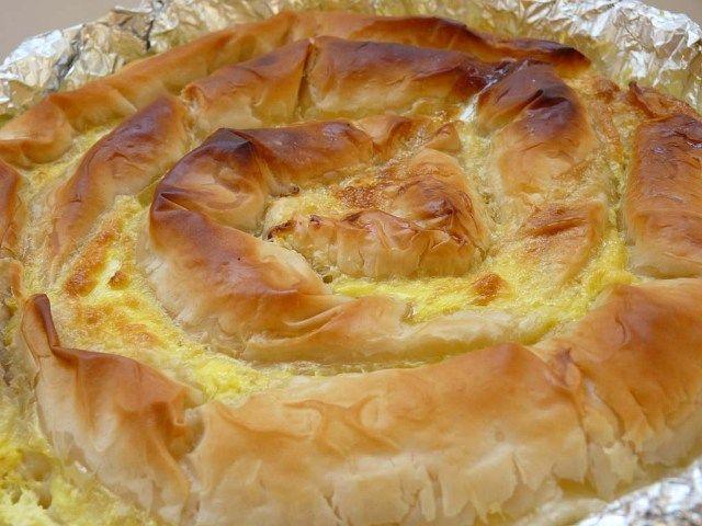 Mod de Preparare: Amestecati branza cu ceapa taiata marunt, marunt, cu patrunjelul tocat si cu 2 oua, si amestecati bine. Topiti untul in uleiul de masline. Ungeti cate 3 foi de placinta cu unt si la un capat asezati o parte din umplutura (cam 4 linguri), apoi rulati foile, obtinand un sul. Asezati sulurile formate, unul in contnuarea celuilalt, formand o spirala care sa ocupe toata tava. Bateti celelate 2 oua, adaugati laptele, si turnati deasupra placintei. Apoi turnati si 100ml apa minerala peste, si bagati la cuptor, la foc mediu, pentru 30 de minute... pana se face rumena si frumoasa.