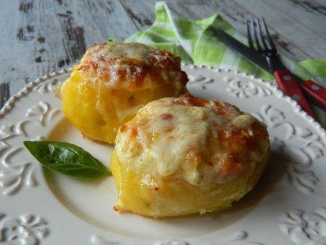 Cartofii se spala si se curata cu un burete aspru. Se inteapa usor, cu o furculita de jur imprejur, se ung cu ulei si se pun intr-o tava tapetata cu hartie de copt. Se coc in cuptor la 200 C pentru 50-60 min, sunt gata cand furculita intra usor. Se lasa sa se racoreasca cateva momente apoi taiem cu grija capacele. Se scobesc de miez, cu grija, lasand putin miez pe coaja. Miezul se pune intr-un vas si se paseaza. Intr-o tigaie se pune restul de ulei la incins, se adauga muschiul taiat cubulete si se lasa cca 2 min sa se prajesca. Se scoate in vasul cu  miez de cartofi iar in uleiul ramas se adauga ceapa taiata marunt. Se lasa sa se prajeasca pana devine usor aurie. Se lasa sa se racoreasca 1-2 min, apoi se pune peste cartofi. Se adauga 1 ou, sare si piper dupa gust si branza telemea rasa. Se amesteca bine pana formam o compozitie omogena. Se umplu cartofii scobiti cu compozitia formata, se pun din nou in tava si se dau la cuptor pentru 15 min -160 C si pentru 5 min cuptorul pe grill, pentru a se rumeni usor. Se servesc cartofii calzi cu sos de iaurt si patrunjel taiat marunt. Sursa: realitatea.net