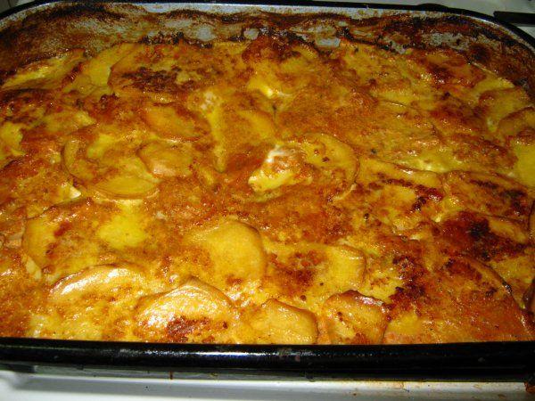 Mod de preparare: Se calesc, impreuna carnea tocata, ceapa tocata marunt si bulionul in putin ulei, timp de 10-15 min. Se condimenteaza, dupa gust. Cartofii se curata si se taie rondele, cam de 1 cm. grosime. Se unge cu ulei, o cratita sau tava adanca. Se pune un strat de cartofi, unul de carne, ultimul strat fiind de cartofi. Se pune apa cat sa acopere. Se da la cuptor (incins in prealabil), pana se rumenesc cartofii. Se bat bine ouale, se sareaza si se toarna deasupra.