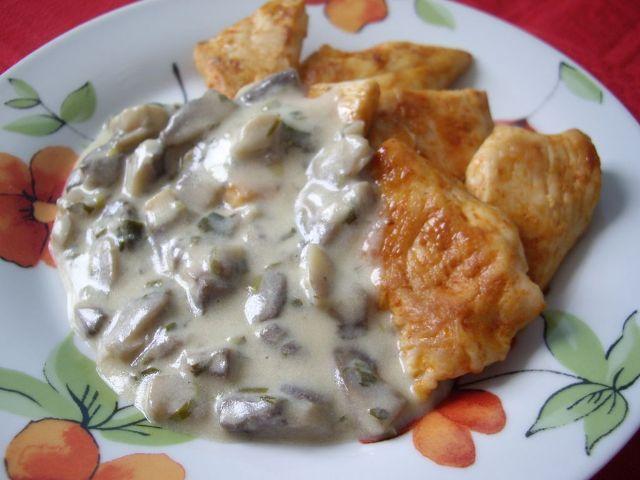 Mod de Preparare: Se amesteca intr-un vas o lingura de unt topit cu sare si piper si se ung bucatile de piept de pui. Se dau la cuptor pentru 10 minute, dupa care se intorc si se mai lasa 10 minute. In caz ca nu aveti la indemana un grill, se poate folosi si prajit pieptul de pui. Se face sosul. Se topesc 2 linguri de unt intr-o tigaie, se adauga ciupercile curatate si taiate feliute. Se calesc pana se inmoaie. Se presara faina si se toarna laptele si putina apa, amestecand continuu cu un tel, pana se leaga sosul. Se adauga smantana. Se potriveste de sare si piper. Se serveste pieptul de pui cu sosul fierbinte.