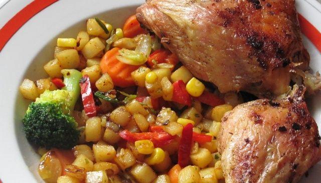Mod de preparare: Pulpele de pui se trec prin flacara, se spala apoi se pun la scurs pe un blat din lemn. Intr-un vas termorezistent se pune uleiul, se adauga pulpele si se ung pe ambele parti. Se presara sare si piper, dupa gust, apoi se introduc in cuptorul incalzit la 160 gr timp de cca 20 min. Cand devin aurii, se scot din cuptor si se asaza pe platou alaturi de legume pentru servit.