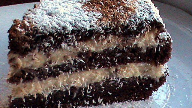 Pentru crema: Se fierb budincile conform intructiunilor de pe pachet. Gelatina se hidrateaza in 3 linguri de apa, apoi se dizolva si se adauga la budinca un pic calduta. Amesteca si lasam sa se raceasca, intre timp batem frisca cu doua linguri de zahar pudra. Dupa ce s-a racit crema, adaugam nuca de cocos si frisca batuta. Pentru sirop se fierbe apa cu zaharul, se raceste si se adauga esenta de migdale. Pentru asamblare, se insiropeaza blaturile, crema se imparte in doua si ungem cu ea blaturile.
