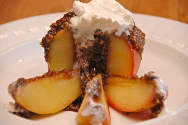 Mod de preparare: Spala merele si taie-le un capac. Scobeste-le cu atentie si stropeste interiorul cu zeama de lamaie. Adauga o lingurita cu miere in fiecare mar si umple cu nuca zdrobita, stafide si scortisoara dupa gust. Da la cuptor 20-25 de minute sau pana se inmoaie merele. Intre timp, pentru sos, pune intr-o tigaie zaharul si cand incepe sa se caramelizeze adauga smantana si amesteca bine. Pune apoi si amesteca bine pana obtii un sos fin si cremos. Scoate din cuptor si serveste mere coapte cu nuca si caramel deasupra.