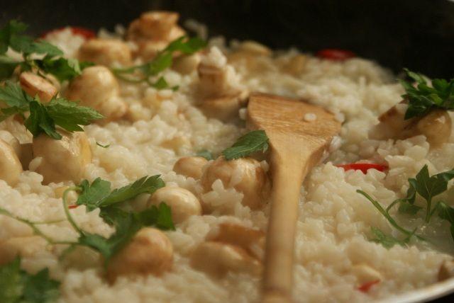 Mod de Preparare: Se lasa uleiul sa se incinga, abia apoi se adauga ceapa (spalata, tocata marunt). Se adauga bulionul (dizolvat in putina apa). Se condimenteaza cu sare si piper. Se adauga apoi ciupercile (spalate si feliate marunt). Se lasa la foc mediu. Se adauga si orezul. Se mai amesteca din cand in cand. Se poate servi ca si fel principal, intrucat este o mancare satioasa.