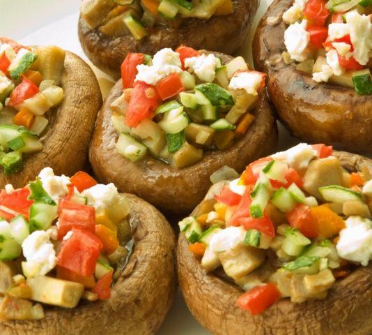 Mod de preparare: Taie ceapa marunt si aureste-o in putin ulei incins impreuna cu usturoiul feliat. Curata ciupercile si taie marunt piciorusele. Taie ceapa marunt si aureste-o in putin ulei incins impreuna cu usturoiul feliat. Curata ciupercile si taie marunt piciorusele. Adauga peste ceapa ardeii taiati julien si piciorusele, iar dupa ce s-au inmuiat, pune rosiile tocate marunt. Sareaza si pipereaza dupa gust, presara putin cimbru si lasa sa scada sosul. Umple palariile ciupercilor cu amestecul de legume si asaza-le intr-o tava. Da la cuptor 15-20 de minute. Serveste cu paine prajita sau felii de mamaliga rece trase in putin ulei de masline.