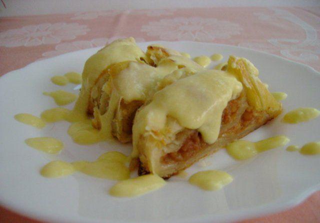Mod de Preparare: Curatam de coaja si cotorul merelor si le taiem fin, amestecam scortisoara cu coaja de la lamaie si zaharul. Pesmetul il rumenim in 50 gr unt, untul ramas il topim. Aluatul il impartim in 2 parti egale si le ungem cu unt topit, apoi pe o jumatate de foaie asezam 1/2 din pesmet, apoi 1/2 din mere, si 1/2 din stafide si 1/2 din amestecul de zahar Rulam cu grija si sigilam bine capetele. Ungem cu unt topit. Repetam operatiunile si la a 2 foaie. Dam la cuptorul preicalzit la 180 grade timp de o ora. Intre timp facem crema de vanilie: Laptele il punem la fiert, intre timp mixam galbenusurile cu zaharul pana se albesc si adaugam si faina si mixam pana la incorporare. Cand laptele a inceput sa fiarba adaugam un praf de sare si esenta de vanilie apoi il luam de pe foc si il turnam peste mixul de galbenusuri, amestecam cu o lingura de lemn pana la omogenizare apoi turnam inapoi il oala in care a fiert laptele si il lasam la foc mic se ingroasa, dar sa curga de pe lingura, cam 8-10 minute. Pe o farfurie turnam sosul de vanilie cald iar deasupra o felie de strudel.