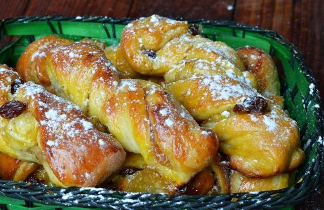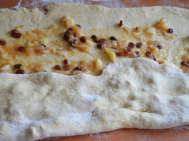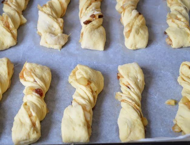 Mod de preparare: Curatam merele si le taiem cubulete. Adaugam zaharul, amidonul, stafidele si romul. Le punem intr-o craticioara pe foc pana cand zaharul este complet dizolvat si merele s-au inmuiat. Adaugam scortisoara si lasam deoparte sa se raceasca. Dizolvati mierea, untul si drojdia in laptele cald. Le amestecati si adaugati ouale apoi faina, putin cate putin. Lasati la dospit pana isi dubleaza volumul. Rasturnati aluatul pe suprafata de lucru infainata si framantati pana ce aluatul nu se mai lipeste de maini. Intindem o foaie dreptunghiulara si intindem compozitia de mere pe toata suprafata. Pliem foaia in doua pe lungime. Apoi pliem in trei obtinand astfel un fel de rulou, dar plat. Taiem ruloul obtinut pe latime, obtinand mai multe fasii nu foarte late. Rasucim fiecare fasie de aluat si le asezam in tava tapetata cu hartie de copt. Le ungem cu galbenus de ou batut cu lapte. Le dam la cuptor, la foc mediu, pana se rumenesc usor. Facem un sirop din apa si zahar si ungem rasucitele imediat ce le scoatem din cuptor. Optional le puteti presara cu zahar pudra.