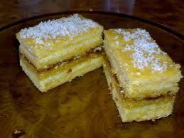 Ingrediente: 5 oua, 100g miere, 160g gris, 100g zahar pudra, 50g faina, un praf de copt, 2 linguri cacao, 100g gem de afine sau zmeura, 100g cocos ras.
