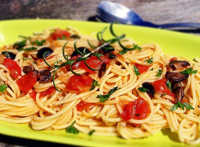 Mod de prepapare: Pastele se fierb conform instruncţiunilor de pe pachet. Între timp prepară sosul: căleşte ceapa în puţin ulei, adaugă usturoiul tocat mărunt, pune vinul combinat cu puţina apă şi lasă totul să să înabuşe câteva minute. Se adaugă apoi roşiile tăiate mărunt, măsline şi sucul de la roşii.  Se lasă să fiarbă până când sosul se îngroaşă şi se condimentează după gust. Sosul se toarnă peste pastele bine scurse, se presară pătrunjel verde şi se servesc imediat.