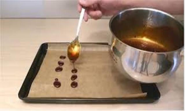 Se încălzește la foc mic până la 145°C. Dacă nu aveți un termometru de gătit, înmuiați o lingură în tigaia de zahăr gătit, apoi imediat într-un bol cu apă rece. Luați zahărul cu degetele: preparatul trebuie să aibă un aspect crocant precum caramelul și nu ar trebui să mai curgă.