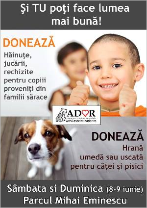 Dragi iubitori de animale si de copii, in weekendul 8-9 iunie va asteptam pe toti in parcul Mihai Eminescu din Botosani, cu marea rugaminte de a dona hainute, jucarii, rechizite, pentru copiii din familiile sarace, si hrana uscata sau umeda pentru cateii si pisicile din grija Ador.