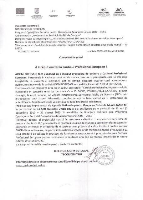Emiterea acestor carduri va avea loc în cadrul proiectului „Cardul profesional european – soluție europeană în căutarea unui loc de muncă”.