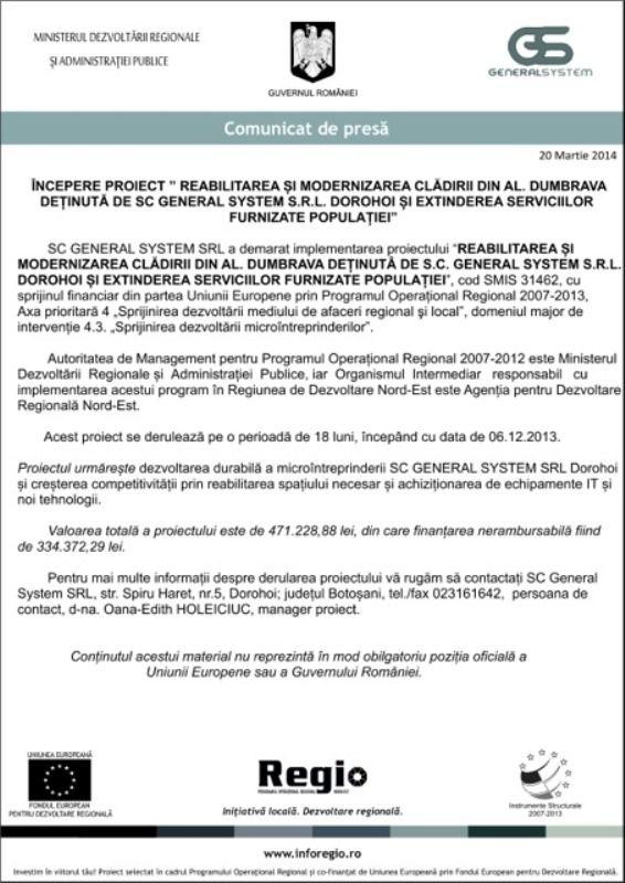 SC GENERAL SYSTEM SRL a demarat implementarea proiectului „REABILITAREA ȘI MODERNIZAREA CLĂDIRII DIN AL. DUMBRAVA DEȚINUTĂ DE SC GENERAL SYSTEM S.R.L. DOROHOI ȘI EXTINDEREA SERVICIILOR FURNIZATE POPULAȚIEI”, cod SMIS 31462, cu sprijinul financiar din partea Uniunii Europene prin Programul Operațional Regional 2007-2013, Axa prioritară 4 „Sprijinirea dezvoltării mediului de afaceri regional şi local”, domeniul major de intervenție 4.3. „Sprijinirea dezvoltării microîntreprinderilor”. (Andrei B.)