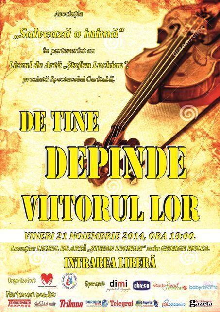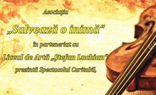 Asociația “Salvează o inimă” organizează, în parteneriat cu Liceul de Artă “Ștefan Luchian” din Botoșani, vineri, 21 noiembrie 2014, începând cu ora 18.00, spectacolul caritabil “De tine depinde viitorul lor”, susținut de elevii liceului.