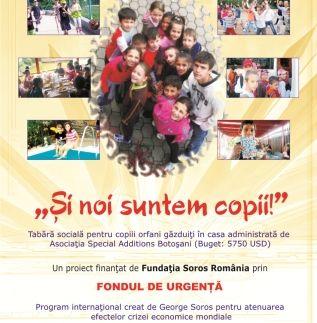 Asociaţia Special Additions a organizat miercuri, 13.10.2010, conferinţa de închidere a proiectului „Şi noi suntem copii!”, finanţat de Fundaţia Soros România, prin programul „Fondul de Urgenţă”.