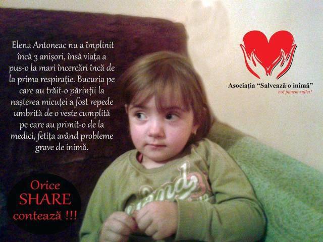 Elena Antoneac nu a împlinit încă 3 anișori, însă viața a pus-o la mari încercări încă de la prima respirație. Bucuria pe care au trăit-o părinții la nașterea micuței a fost repede umbrită de o veste cumplită pe care au primit-o de la medici, care au diagnosticat-o pe Elena cu stenoză valvulară pulmonară şi o mulţime de alte complicaţii.