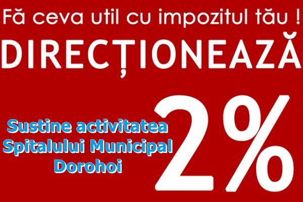 Daca doriti ca, prin redirectionarea a 2% din impozitul pe care dumneavoastra l-ati platit statului pentru salariul din anul 2014, sa sprijiniti Asociatia "Sanatatea dorohoienilor", va rugam completati formularul de mai jos. Il puteti depune direct la secretariatul unitatii sau expedia prin posta la adresa: Bd. Victoriei nr. 75, Dorohoi.