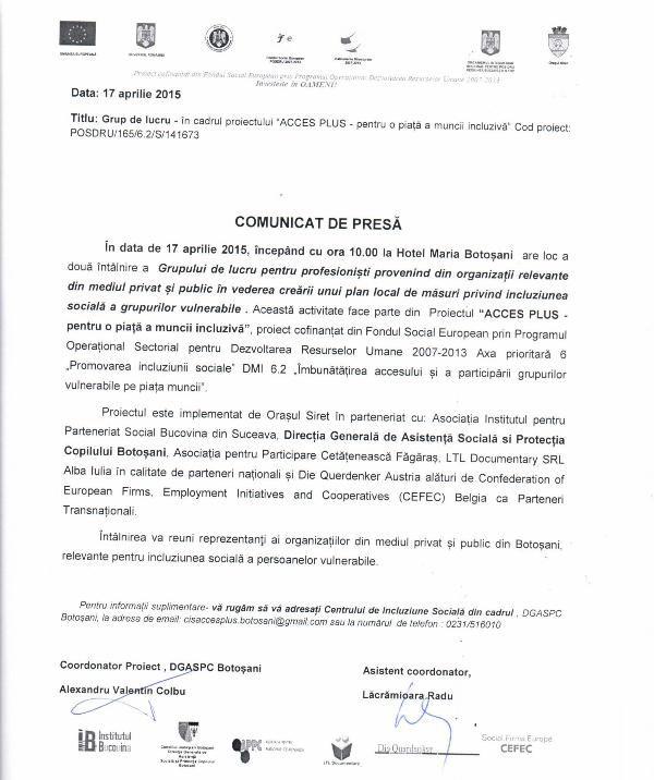 În data de 17 aprilie 2015, începând cu ora 10.00 la Hotel Maria Botoșani are loc a două întâlnire a Grupului de lucru pentru profesioniști provenind din organizații relevante din mediul privat și public în vederea creării unui plan local de măsuri privind incluziunea socială a grupurilor vulnerabile.