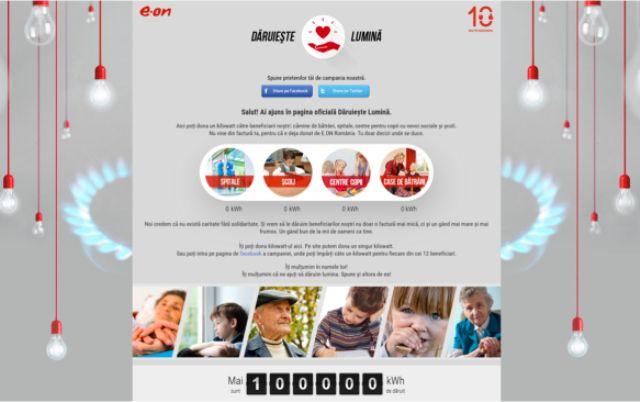 „Dăruieşte lumina”, una dintre cele mai mari campanii de social media derulate de E.ON România, s-a încheiat cu succes, sâmbătă, 25 aprilie, când au fost donați ultimii din cei 100.000 kWh oferiți de companie spre beneficiul unui număr de 12 instituţii – spitale, şcoli, case de copii şi case de bătrâni din 10 județe.