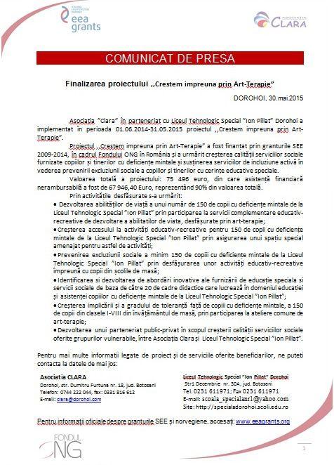 Asociația „Clara” în parteneriat cu Liceul Tehnologic Special „Ion Pillat” Dorohoi a implementat în perioada 01.06.2014-31.05.2015 proiectul „Creștem împreună prin Art-Terapie”.