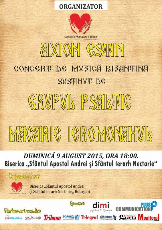 Asociația "Salvează o inimă" organizează, duminică, 9 august 2015, începând cu ora 18.00, la Biserica "Sfântul Apostol Andrei" și "Sfântul Ierarh Nectarie" din Botoșani, din curtea spitalului de copii din Botosani, concertul de muzică Bizantină "Axion Estin".