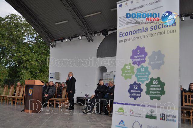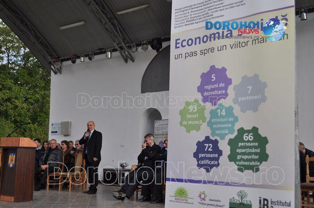 Astazi nu vreau decat sa-mi exprim bucuria imensa alaturi de comunitate, alaturi de partenerii nostri de isprava din cele cinci regiuni ale tarii cat si fata de partenerul transnational din Belgia reprezentat printr-un membru de seama la aceasta prezentare si la seminarul ce va avea loc la Dorohoi. Despre ce fac aceste structuri de economie sociala vom vorbi mai pe larg in viitorul apropiat cand ele vor incepe sa functioneze efectiv deoarece in acest moment, desi utilajele sunt achizitionate si puse in functiune, o parte de angajati sunt inca la cursurile de formare. Subliniez faptul ca proiectul ofera in perioada subventionata de Uniunea Europeana aproape totul; de la formare la utilaje, de la materie prima la publicitate etc.
