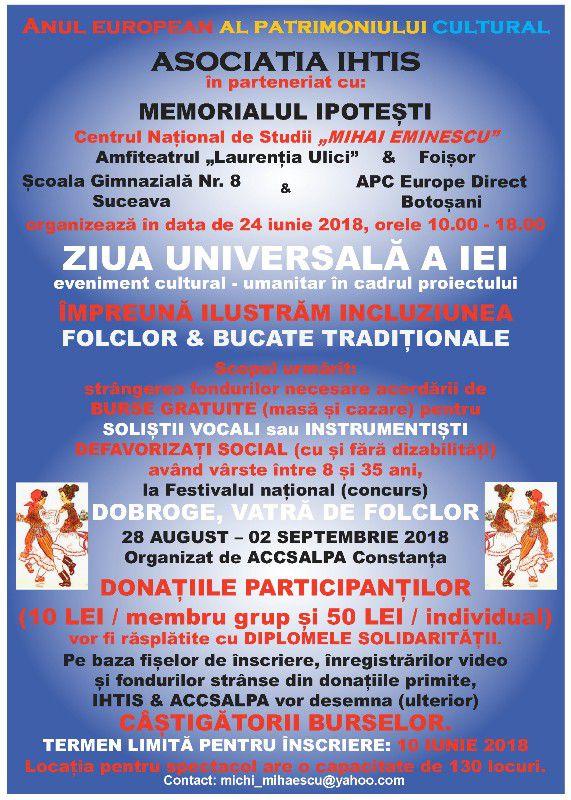Asociația IHTIS punctează Anul European al Patrimoniului Cultural, printr-un eveniment cu caracter umanitar organizat în data de 24 iunie 2018 / orele 10.00 – 18.00, în parteneriat cu: Memorialul Ipotești – Centrul de Studii „Mihai Eminescu” / Amfiteatrul „Laurenția Ulici” & Foișor (locația evenimentului); APC Europe Direct Botoșani; Școala Gimnazială Nr.8, Suceava.