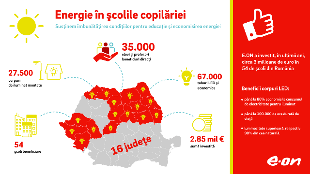 „Energie în școlile copilăriei”, programul derulat de compania E.ON România dedicat îmbunătățirii condițiilor de studiu şi eficientizării consumului de energie prin iluminarea bazată pe tehnologie led a sălilor de clasă, a continuat şi în acest an în şcoli şi licee din judeţele Sibiu, Harghita, Bistriţa Năsăud, Maramureş, Timiş, Hunedoara, Bacău, Iaşi, Botoşani şi Vaslui.