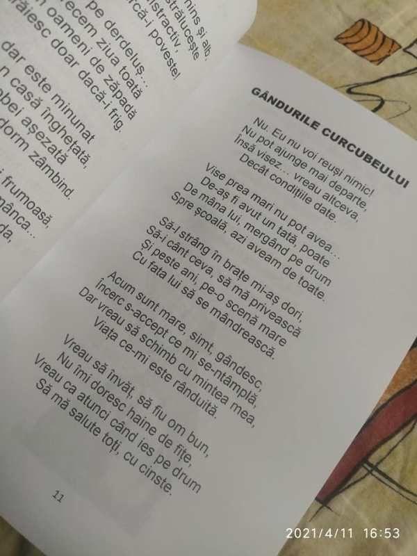Laura mi-a urmat sfatul. „Un vis mi-a cuprins inima: / Să fiu regină peste-ale mele visuri / Îmi doresc…/ Mă văd învingătoare! / Poeziile fac din viața mea / O lume plină de lumină. / Când scriu pe foaia albă, / Văd o lume mare, mare…/ Și păsări care zboară frumos. / Visez să fiu pasăre!”.