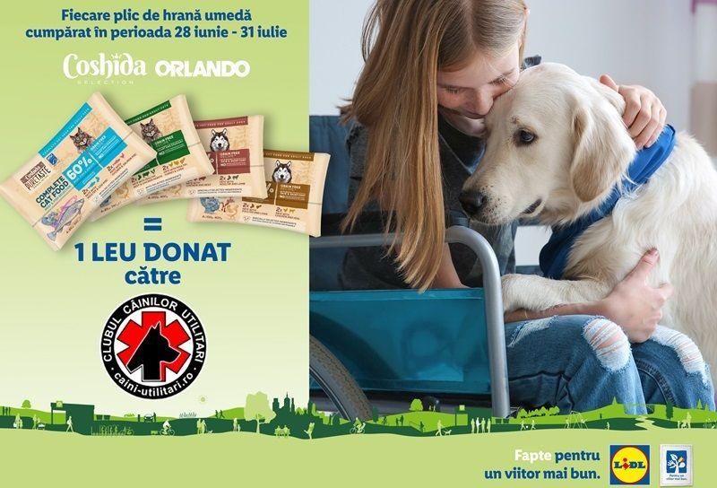 În perioada 28 iunie – 31 iulie 2021, clienții Lidl pot contribui la susținerea programelor dedicate pregătirii câinilor de utilitate socială desfășurate de asociația Clubul Câinilor Utilitari. Pentru fiecare produs achiziționat din gamele Orlando și Coshida, dintre cele două semnalizate la raft, Hrană umedă pentru câini (6,99 lei) și Hrană umedă pentru pisici (6,99 lei), Lidl va direcționa 1 leu către asociație.