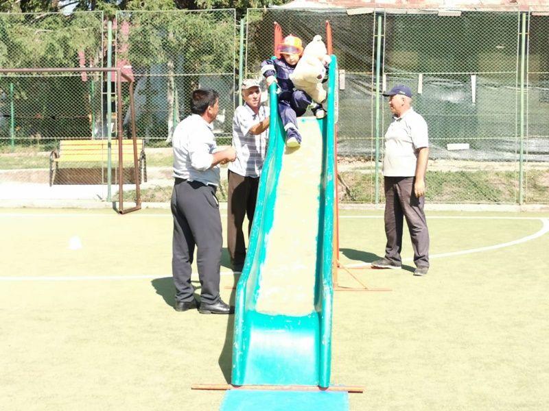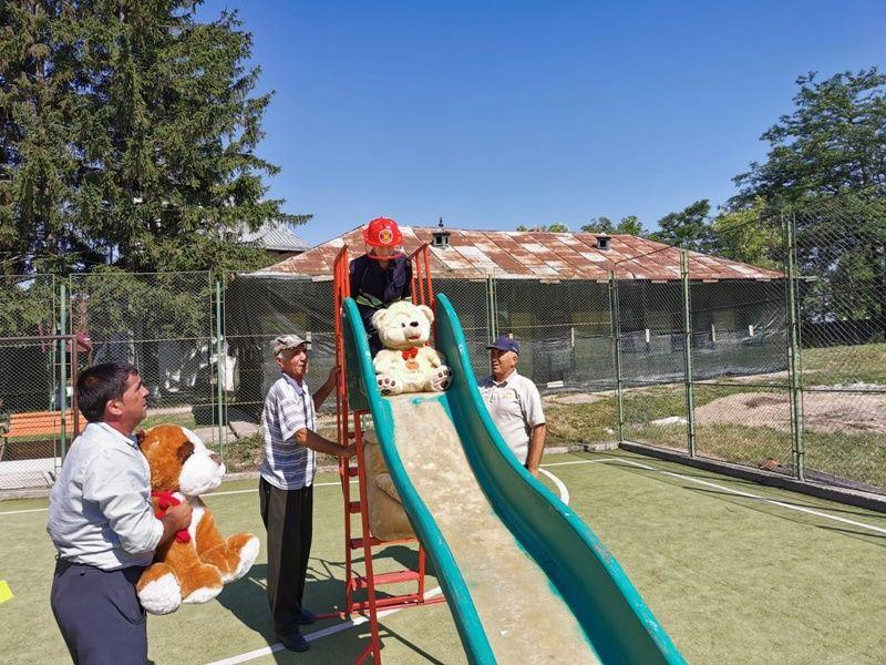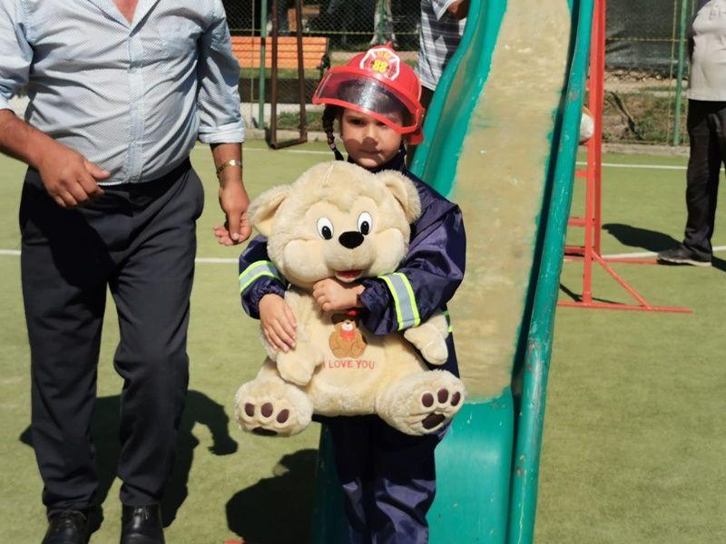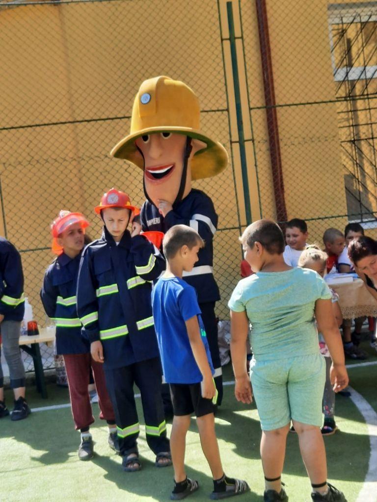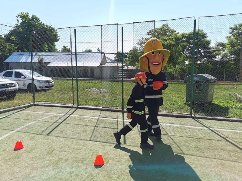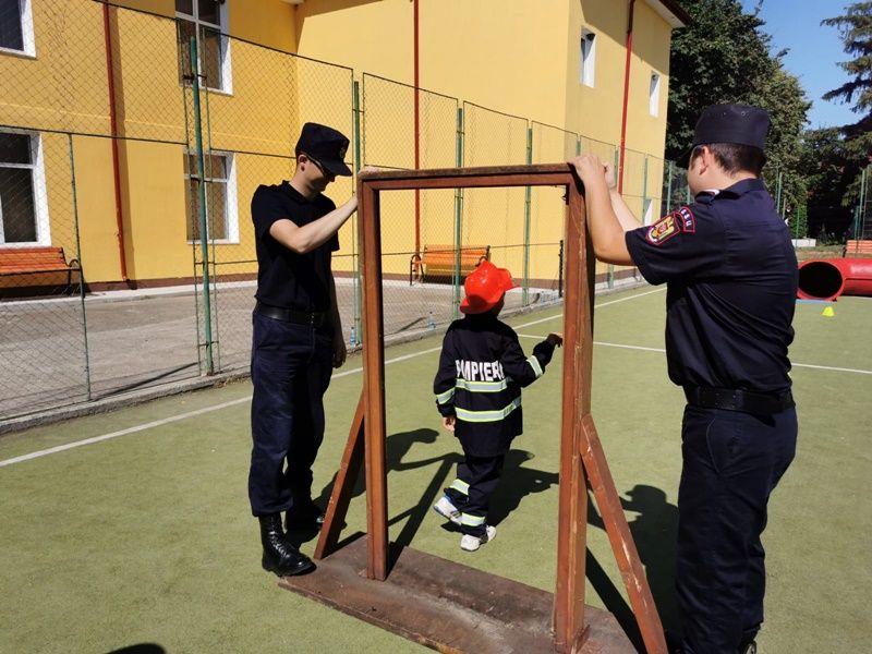 Echipați cu costume de intervenție, micii pompieri au trecut printr-un tunel, au salvat ursuleţul sau cățelul de pluș de pe tobogan, au alergat printre jaloane şi au stins un incendiu imaginar. Au fost răsplătiți cu dulciuri și multe aplauze.