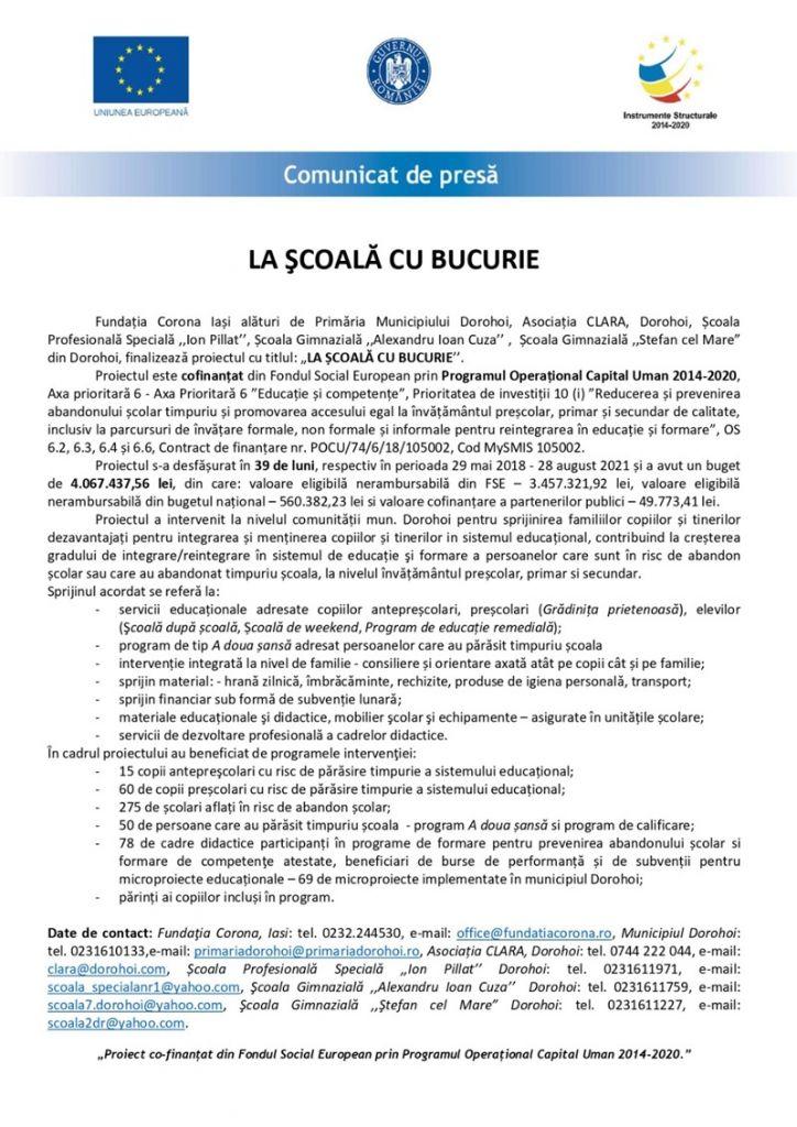 Fundația Corona Iași alături de Primăria Municipiului Dorohoi, Asociația CLARA, Dorohoi, Școala Profesională Specială „Ion Pillat’’, Școala Gimnazială „Alexandru Ioan Cuza’’, Școala Gimnazială „Stefan cel Mare” din Dorohoi, finalizează proiectul cu titlul: „LA ȘCOALĂ CU BUCURIE’’.