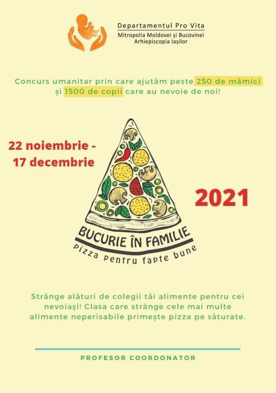 Mitropolia Moldovei și Bucovinei organizează, prin intermediul departamentului Pro Vita al Protopopiatului Dorohoi, proiectul social-filantropic „Bucurie în Familie – Pizza pentru fapte bune”, ajuns anul acesta, la ediția a V-a, în parteneriat cu unitățile de învățământ care s-au înscris în această campanie în perioada 22-25 noiembrie.