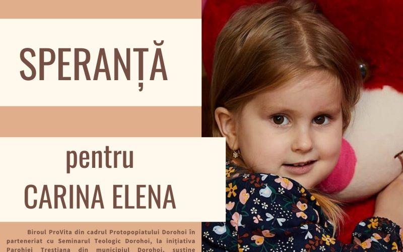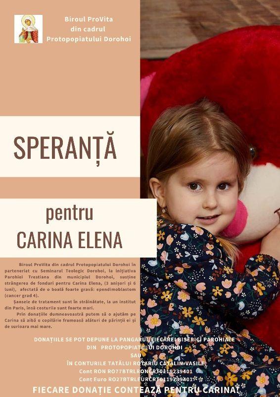 Bună dimineața!Doresc sa fac o precizare la articolul ,, Speranță pentru Carina Elena"".Fetiță se numește Carina Elena Rotariu .O cunosc și îi dorim multă sănătate și poate impreună sa ii dam o șansă la viață.Multumesc !