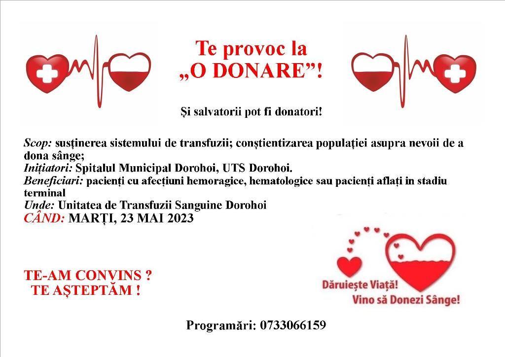 Dacă DA, TE PROVOCĂM LA O DONARE, MARȚI, 23 MAI 2023, la sediul UTS din Spitalul Municipal Dorohoi, începând cu ora 8.30.