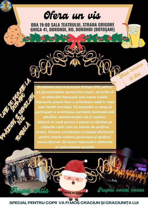 Pe data de 19 Noiembrie, de la ora 19:00, la Sala Teatrului Dorohoi, publicul este așteptat in numar cat mai mare pentru a acorda o mana de ajutor si pentru a le oferi un Craciun copiilor.