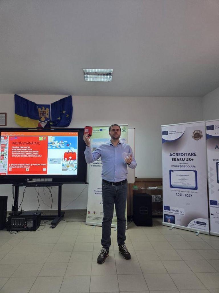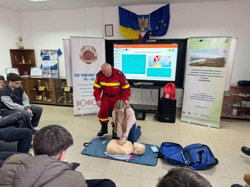 „Este vorba despre instruirea a 12 copii voluntari, elevi ai Liceului „Regina Maria”, în urma unui parteneriat cu unitatea de învățământ. Pe parcursul a patru zile, pe baza unei programe, voluntarii au fost instruiți privind comportarea în timpul dezastrelor, după dezastre și toate măsurile ce trebuie să le ia în cazul acestor situații de urgență. În cadrul programului de instruire, voluntariilor le-a fost prezentat și modul de acordare a primului ajutor și cum se resuscitează o persoană, cu mâinile goale. De asemenea le-a fost prezentat „rucsacul de urgență”, care ar trebui să-l avem toți în casă, rucsac ce cuprinde apă, medicamente, hrană, radio, fluier, lanternă și alte obiecte necesare într-o situație de uregență. La activitățile de instruire au participat și 70 de elevi din cadrul Liceului „Regina Maria”. Pe parcursul proiectului voluntarii din Dorohoi și Ungheni vor participa la o „academie transfrontalieră”, în Republica Moldova, unde vor prezenta ce au învățat. Vor fi și alte activități, flashmob, activități de alarmare-evacuare cu cetățenii, concurs de desen. Voluntarii îi vor învăța pe colegii lor dar și cetățenii, ceea ce au fost instruiți”, a declarat colonelul în rezervă Sorin Barbacariu care, alături de căpitanul în rezervă Bogdan Cîrligeanu, au făcut instruirea voluntarilor.