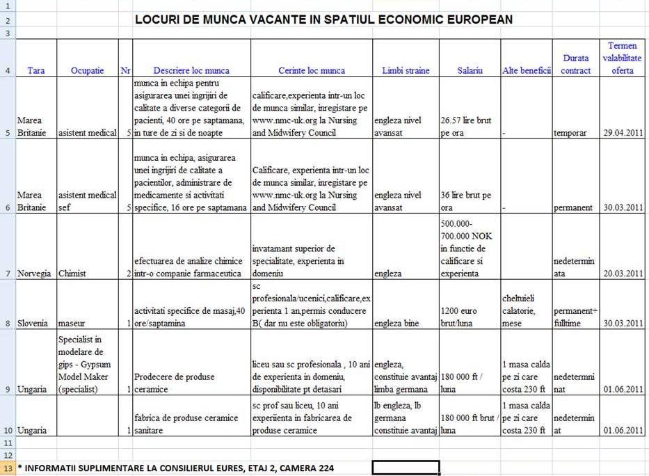 Cei ce doresc să lucreze într-o ţară din spaţiul Uniunii Europene au la dispoziţie 15 locuri de muncă vacante, prin intermediul reţelei EURES. Pentru detalii consultați imaginea atașată. (DorohoiNews.ro)