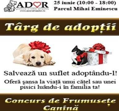 Asociaţia pentru Protecţia Animalelor Ador organizează sâmbătă, 25 iunie, în parcul “Mihai Eminscu” un târg de adopţii pentru căţei şi pisici. Vă aşteptăm cu căţei de rasă, abandonaţi de stăpânii lor, sau cu căţei de rasă comună, foarte iubitori şi inteligenţi, cu puiuţi drăgălaşi, sau cu adulţi protectori, cu pisicuţe jucăuşe şi motănei afectuoşi.