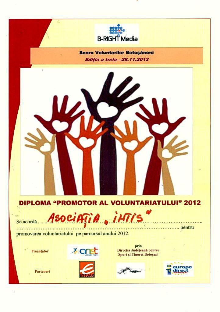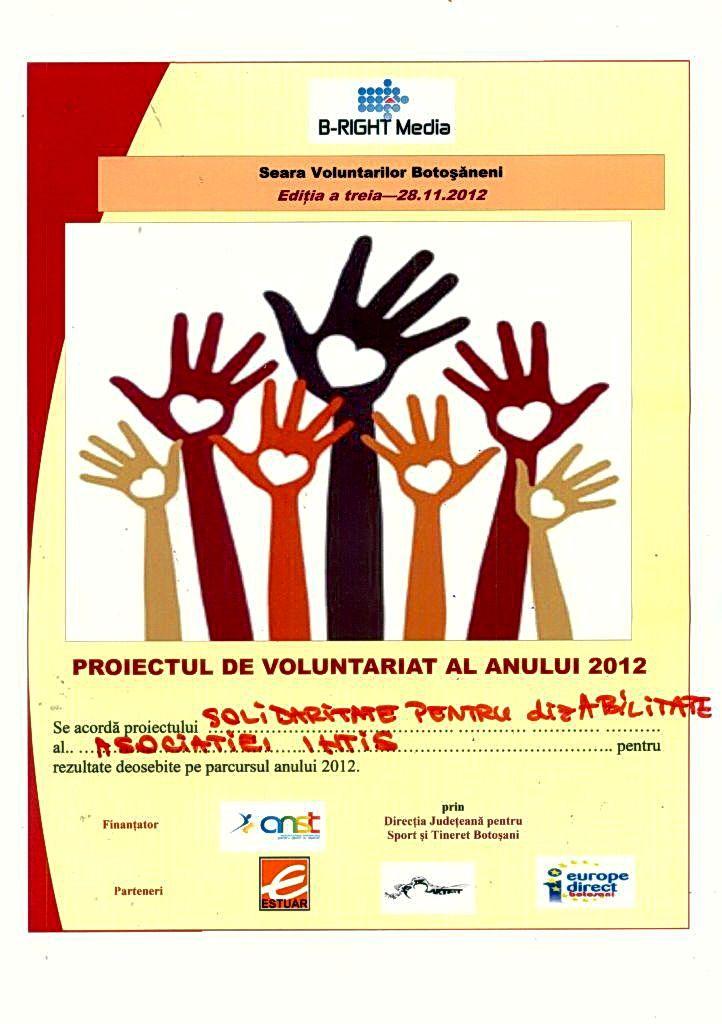 Una dintre cele mai incitante provocări ale Asociaţiei IHTIS, din anul 2012, a constituit-o PROIECTUL “SOLIDARITATE PENTRU DIZ/ABILITATE”, care şi-a găsit confirmarea la cea de-a treia ediţie a Serii voluntarilor botoşăneni, desfăşurată zilele trecute, în organizarea Asociaţiei B-RIGHT MEDIA – Centrul de voluntariat. Într-un cadru festiv şi după o evaluare exigentă, iniţiativa Mihaelei Mihaescu a fost premiată cu diploma specială pentru « Proiectul de voluntariat al anului 2012 », fiind desemnat şi pentru etapa finală a Galei naţionale a voluntarilor.