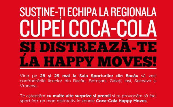Sâmbătă, 28 mai, începând cu ora 8:00, se dă startul meciurilor din cea de-a patra regională a Cupei Coca-Cola, în Sala Sporturilor din Bacău. Până la ora 20:00, alternativ, câte două echipe de fete și două echipe de băieți vor face tot posibilul pentru a ajunge în ultima etapă a competiției. Finalele de la Bacău și festivitatea de premiere se vor desfășura duminică, în intervalul orar 10:00 – 14:00.