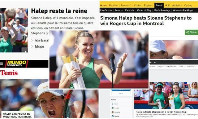 Succesul obținut de Simona Halep la Rogers Cup 2018 a făcut înconjurul lumii. De la Montreal Gazette (Canada), până la BBC (Marea Britanie) și L'Equipe (Franța), marile publicații au marcat victoria muncită a numărului 1 WTA, venită după un meci istovitor, care a durat două ore și 41 de minute și s-a disputat pe o căldură sufocantă.