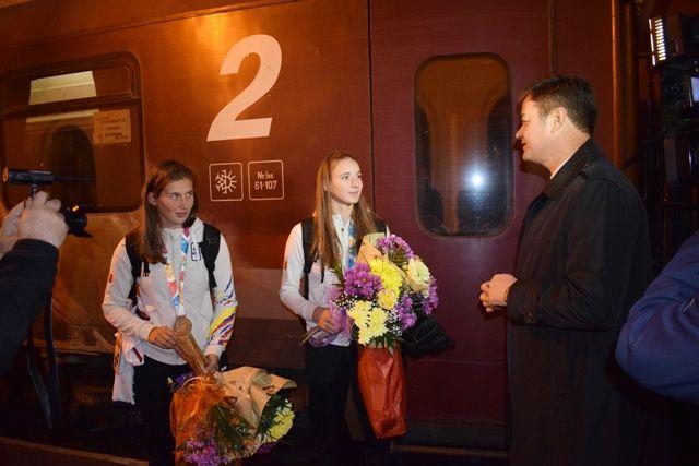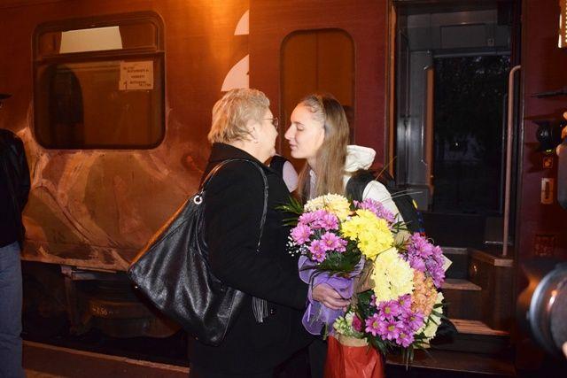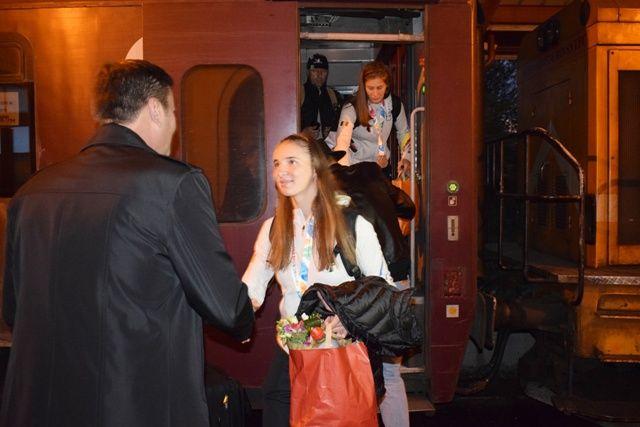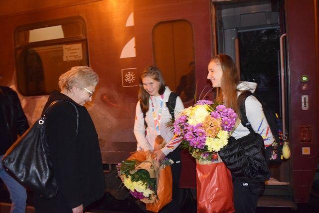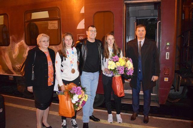 Tabita şi Alina au fost aşteptate la gară, unde au primit buchete de flori şi au fost felicitate de Dan Şlincu pentru performanţa obţinută în concurs, medalia de bronz, la finalul unei curse atipice- parcurgerea unei distanţe de 500 de metri în viteză într-un echipaj de două rame.