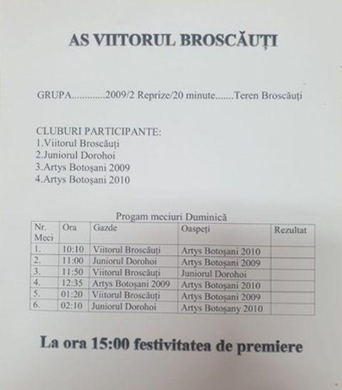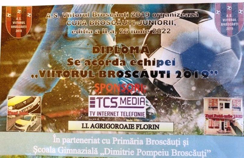 A.S. VIITORUL BROSCĂUȚI 2019 a organizat duminică 26 iunie 2022 CUPA BROSCĂUȚI JUNIORII, aflată la ediția a II-a. Activitatea a avut ca parteneri Primăria Comunei Broscăuți reprezentată de domnul primar Agheorghițoaei Aurel – Costel și Școala Gimnazială „Dimitrie Pompeiu” Broscăuți reprezentată de doamna director – prof. Apostol Iuliana – Andreea.
