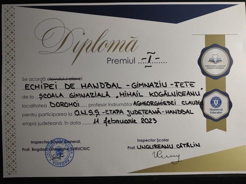 În acest weekend s-a desfășurat, în sala de sport a Școlii Gimnaziale „Mihail Kogălniceanu”, etapa județeană de handbal gimnaziu din cadrul Olimpiadei Naționale a Sportului Școlar, acolo unde, echipa reprezentativă a Școlii Gimnaziale „Mihail Kogălniceanu” s-a autodepășit, reușind să învingă celelalte două adversare prezente la scoruri mai mult decât clare.