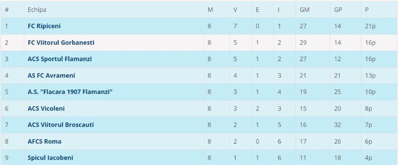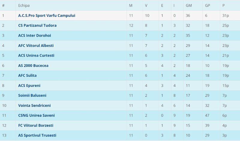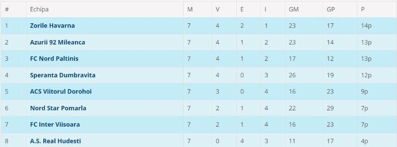 Partizanul Tudora, se impune în deplasare și urcă pe poziția secundă, dar are un joc mai mult disputat, urmând ca în ultima etapă să stea, din cauza excluderii Unirii Stăuceni.