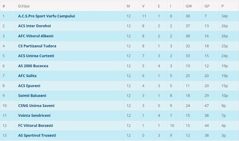 Astfel, Vârfu Câmpului trece la limită pe teren propriu de Sulița, 2-1, asta după ce la pauză scorul a fost același ca la începutul jocului. Inter Dorohoi trece de Bucecea cu același scor după ce la pauză a fost condusă, Unirea Curtești face un set la unu acasă cu Șendriceni, Săveniul dispune cu 5-0 de Viitorul Borzești. Scorul etapei a avut loc la Trușești, Sportivul din localitate fiind realmente umilită, 2-9, de Viitorul Albești.
