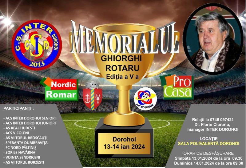 În weekend-ul 13-14 ianuarie 2024 va avea loc la Sala Polivalentă din Dorohoi, ediția a V-a a Memorialului de fotbal „Ghiorghi ROTARU”, cel care a pus bazele clubului ACS INTER DOROHOI.
